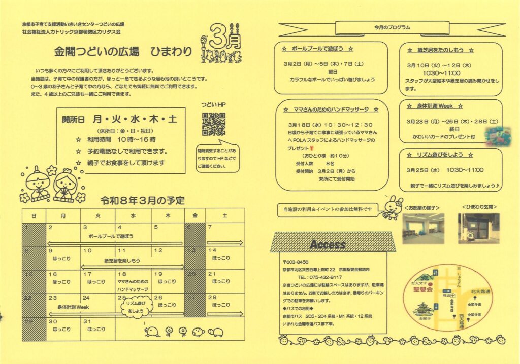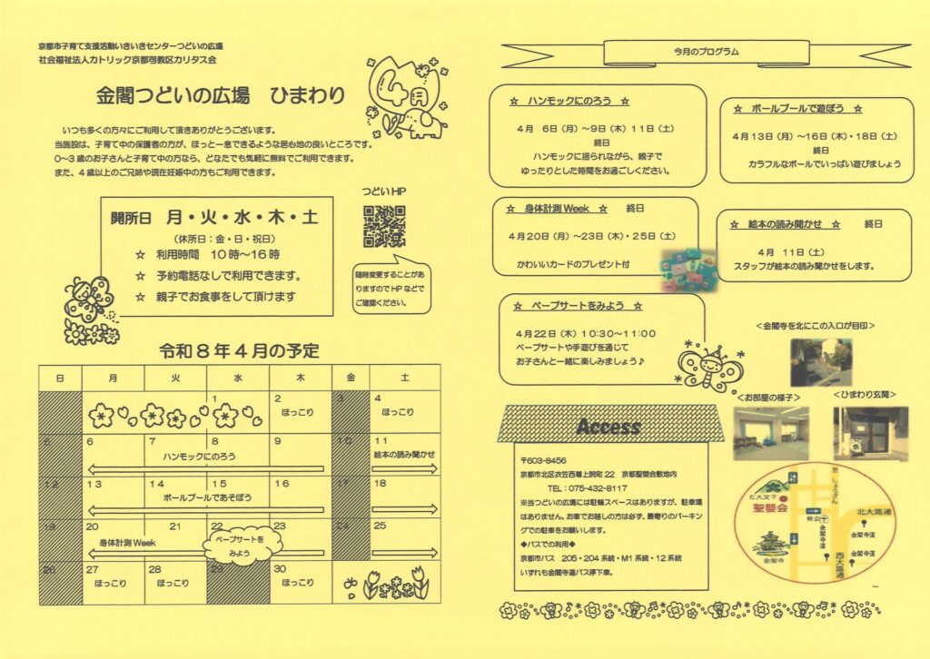 金閣つどいの広場ひまわりは、乳幼児(0〜3歳)の親子が自由に集い、お母さんもお子さんもほっと一息つけるようなそんな居心地の良いのんびりとできる場所です。